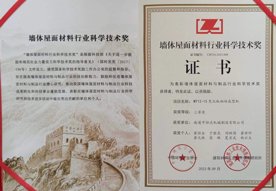 南通市恒達機械制造有限公司獲得墻體屋面材料行業科學技術三等獎。