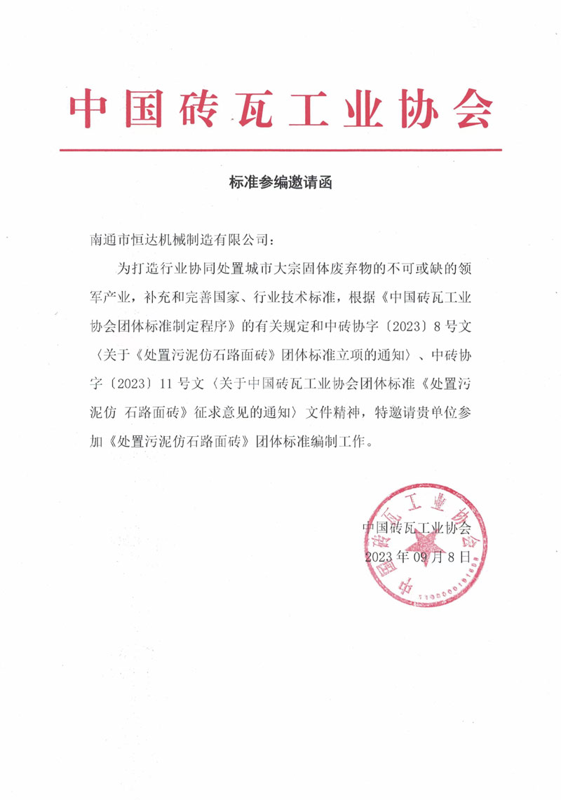 行業(yè)要健康發(fā)展,標準必須先行。再此背景下,2023年10月21-22日,在中國杭州,中國磚瓦協會及時的組織了行業(yè)骨干企業(yè),群策群力,制定高質量標準。南通市恒達機械制造有限公司董事長崔恒全和技術總工于銀龍受邀請參加,為標注的制定貢獻恒達力量。